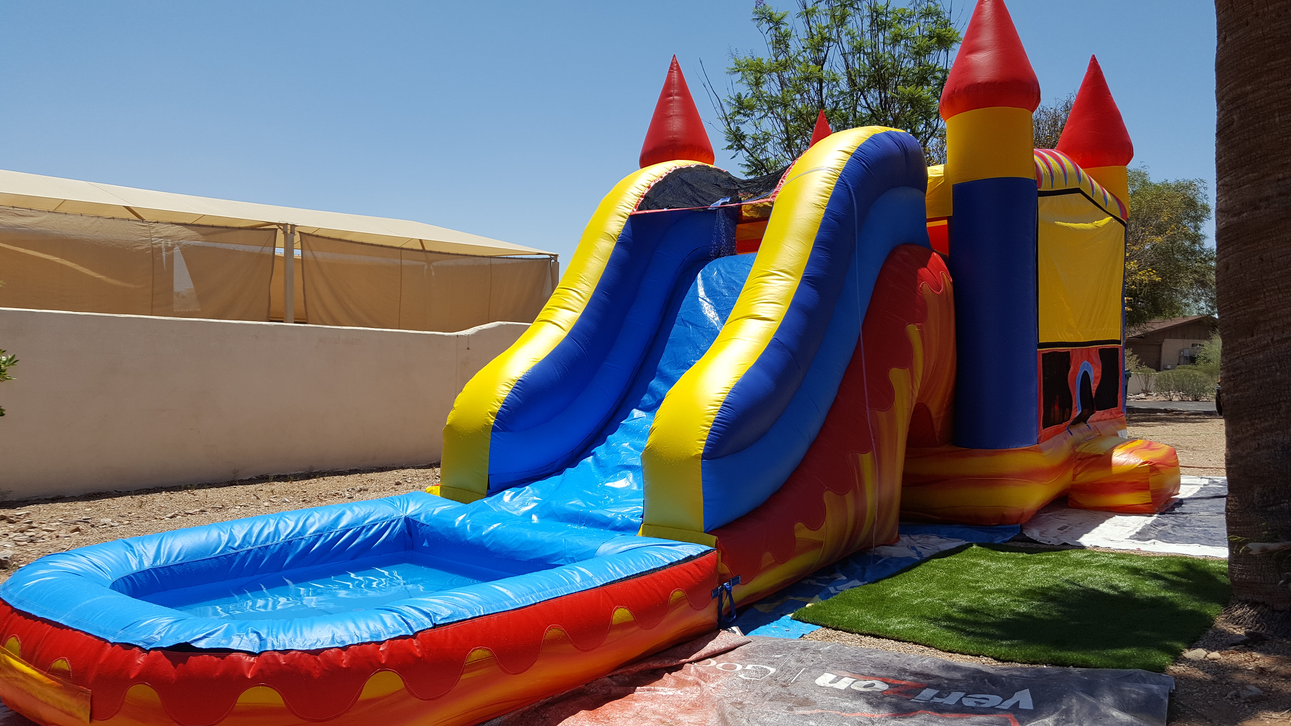 This inflatable combo has a bounce house and a slide with pool and basket ball hoop. Amazing boy inflatable bounce house rentals in Arizona! Ages 3+ Available for rent in: Phoenix, Gilbert, Chandler, Mesa, Scottsdale, Cave creek, Tempe, Fountain Hills, New River, Surprise, Peoria, Glendale, Goodyear, Buckeye, Laveen, Litchfield Park, Tolleson, Waddell, Wittmann, Prescott