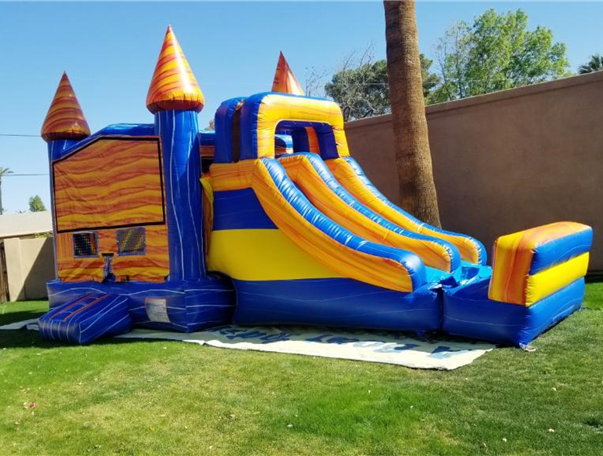 Inflatable bounce house rental with 2 dry slides and basketball hoop ages 3+ Available for rent in: Phoenix, Gilbert, Chandler, Mesa, Scottsdale, Cave creek, Tempe, Fountain Hills, New River, Surprise, Peoria, Glendale, Goodyear, Buckeye, Laveen, Litchfield Park, Tolleson, Waddell, Wittmann, Prescott