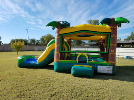Inflatable Tropical bounce house combo rental with slide and pool. Can be wet or dry. Choosing this option it will be dry and not come with water hose or sprinkler. All day rental and you keep over night. ages 4+ Available for rent in: Phoenix, Gilbert, Chandler, Mesa, Scottsdale, Cave creek, Tempe, Fountain Hills, New River, Surprise, Peoria, Glendale, Goodyear, Buckeye, Laveen, Litchfield Park, Tolleson, Waddell, Wittmann, Prescott